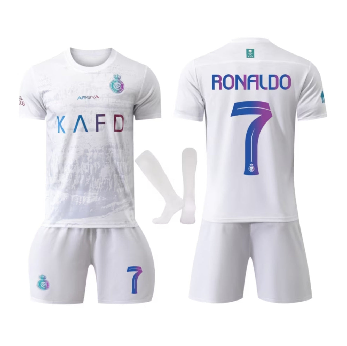 2026 Детски спортен екип на CR7 Роналдо 7, Бял футболен с чорапи RONALDO Al Nassr