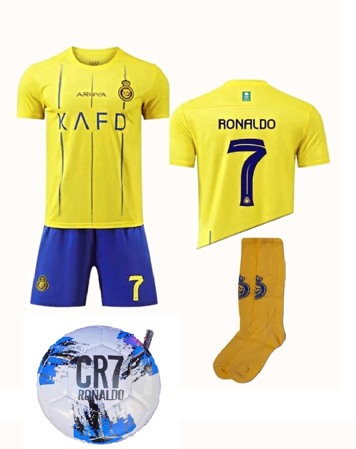 Детски спортен екип на Роналдо 7, футболен с чорапи и топка RONALDO AL NASSR жълт 2024
